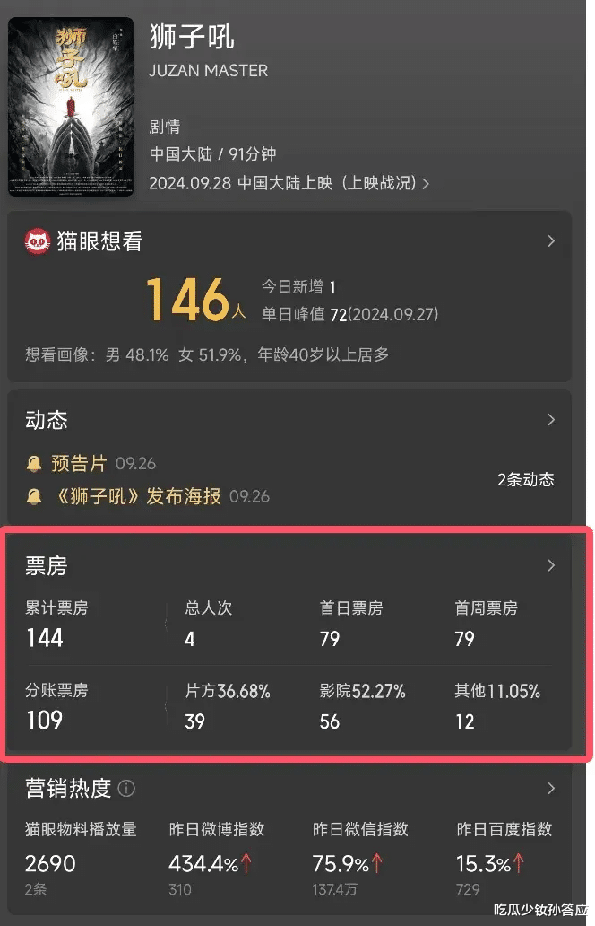 《狮子吼》于9月28日上映,拼凑挤进了国庆档的范畴,但是,其票房发达却令东说念主口呿舌挢。为止目下已上映14天,总票房仅为144元东说念主民币,片方从均分账所得更是少得灾祸.