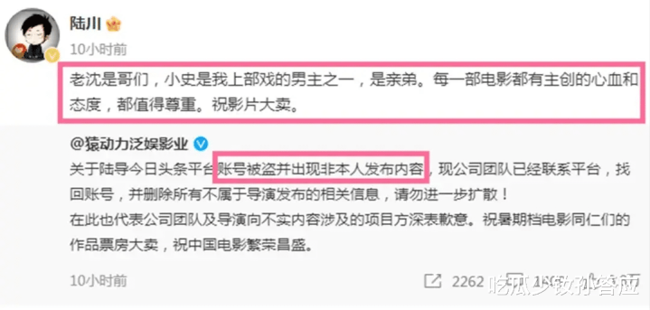 但这炸药味透顶的帖子没多久就隐藏了。自后,陆川那里解说说是因为账号被东说念主黑了,他还转发了个声明,强调我方和茂盛麻花团队关联挺好的,敕令全球要尊重每部电影背后的勉力。