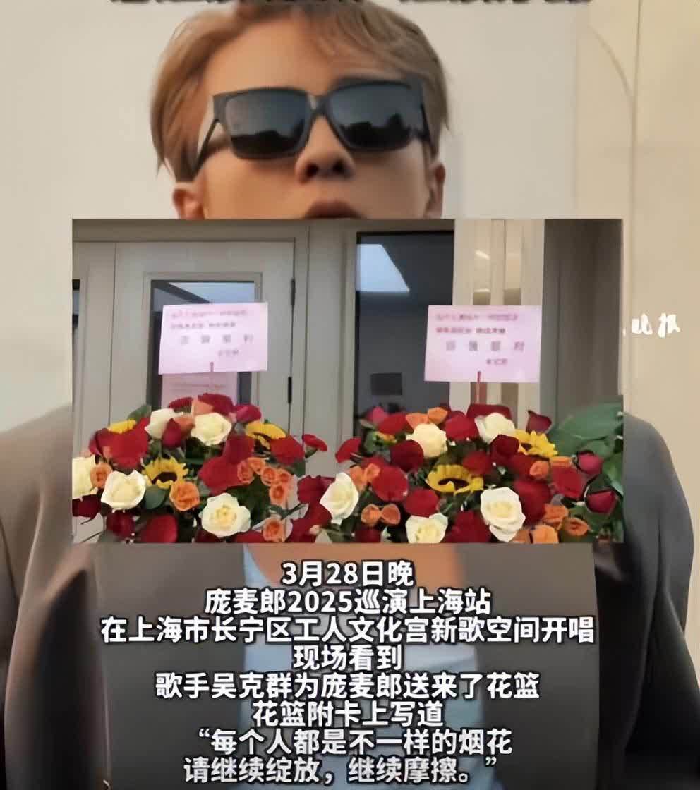 28日的晚上,吴克群提前将花篮送到了庞麦郎演唱会现场,花篮代表着赈济与祝愿,对于庞麦郎来讲,更是一种新的生命力!