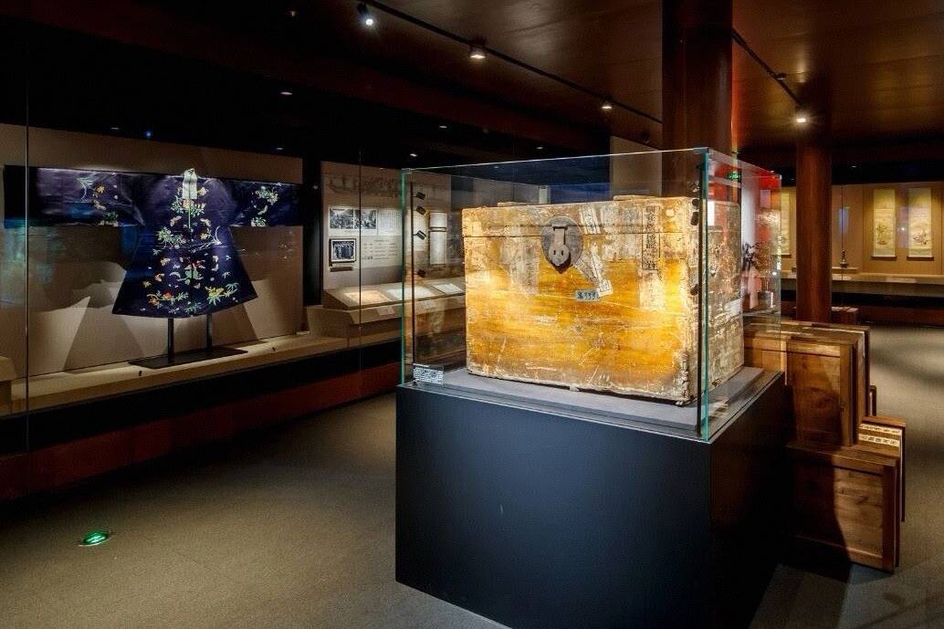 展厅中央,一件斑痕累累、上有不同封条痕迹的大木箱诱骗不雅众贵重。字据档案纪录,箱子内其时装有284件戏衣等物,随文物搬动南下北上。其时装于箱内的一件清康熙石青色折枝花蝶纹妆花缎女帔同步展出。