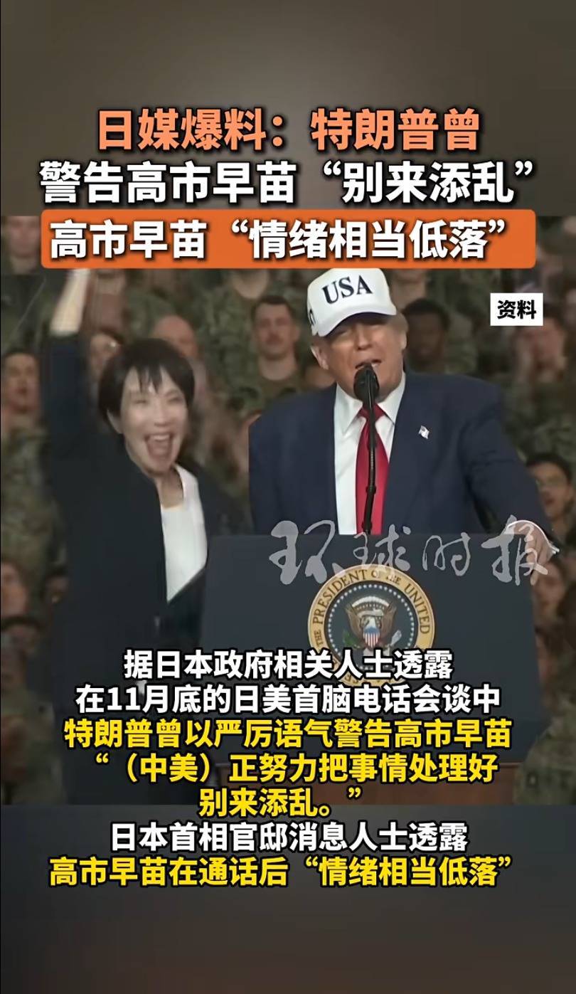 据群众时报征引日本《北海谈新闻》12月14日的报谈称,音书东谈主士显现,在谈及中好意思以及中日相关时,好意思国总统特朗普曾对日本首相高市早苗警告称“别来添乱”。