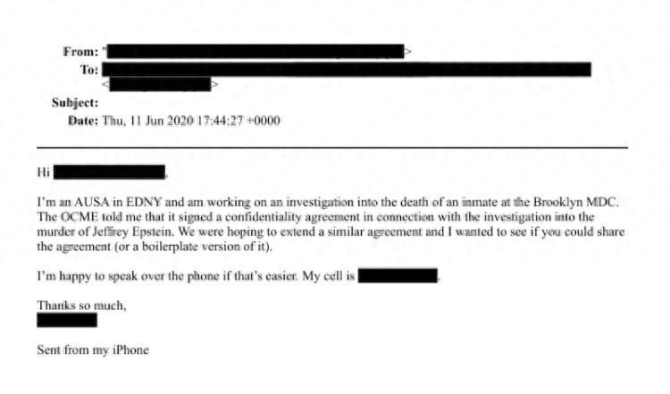 报说念称,这封邮件日历为2020年6月11日,邮件中又名自称“AUSA in EDNY”——可能是“纽约东区联邦助理检验官”缩写——的东说念主,提到了所谓“对杰弗里·爱泼斯坦谋杀案”的走访,“我是纽约东区联邦检验官办公室的助理检验官,现在正走访布鲁克林区大王人会拘留中心又名囚犯的示寂事件。”邮件中写说念。报说念提到,好意思法律讲授部已将发件东说念主和收件东说念主的信息均隐去。