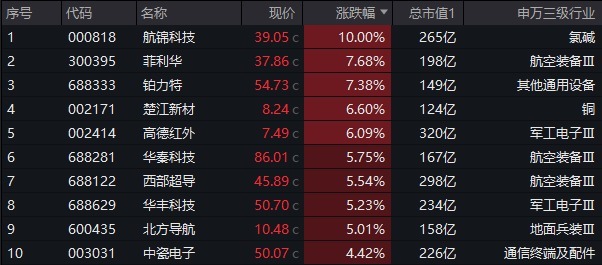 具体手脚份股确认,国防军工ETF(512810)障翳的80只军工龙头中78股飞腾,军事AI倡导股航锦科技全天领涨板块,午后封死涨停板,走出12日9板!菲利华、铂力特大涨超7%,楚江新材、高德红外涨超6%,华秦科技、西部超导、华丰科技等均大幅飞腾。