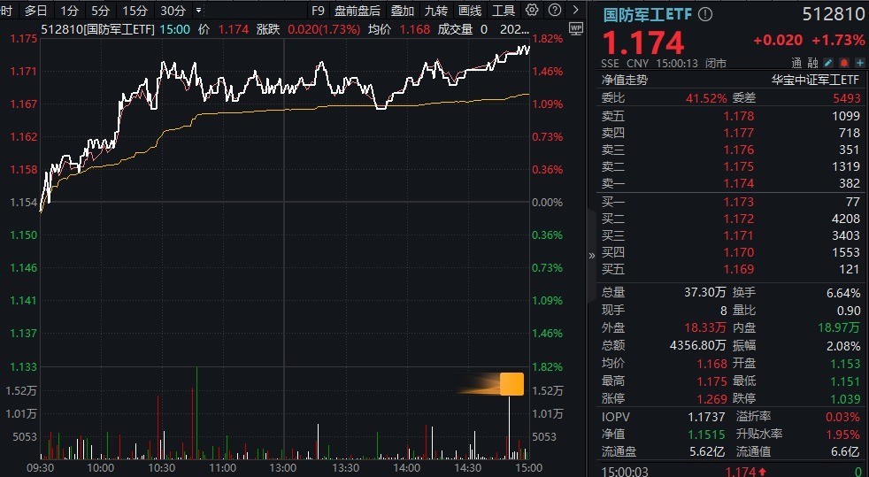 2月19日,AI王者总结欧洲杯体育,行情马上延伸至蕴蓄海陆空科技国防军工板块,场内热点国防军工ETF(512810)全天震撼走高,场内收涨1.73%,全天成交4357万元。