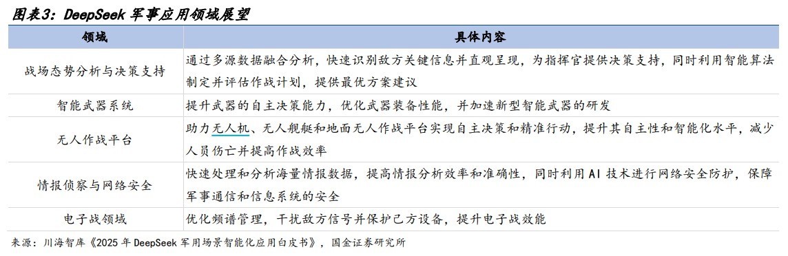 跟着DeepSeek火爆公共,东说念主工智能技艺在军事领域的愚弄受到高度护理。国金证券指出,DeepSeek作为一种先进的东说念主工智能技艺,在国防军工领域展现出多方面的愚弄后劲,涵盖战场态势分析、智能刀兵系统、无东说念主作战平台、谍报考核与网罗安全以及电子战等多个要道领域。