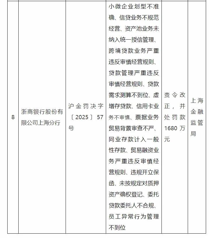 但就在这个节骨眼上,钞票限制打破3.3万亿元的浙商银行迎来“当头棒喝”,1月末,其上海分行因多个业务畛域作歹违规被罚1680万元。