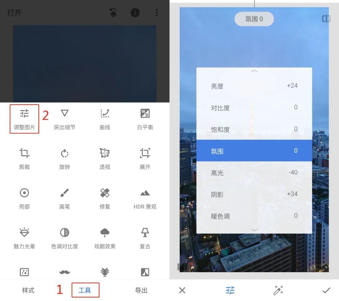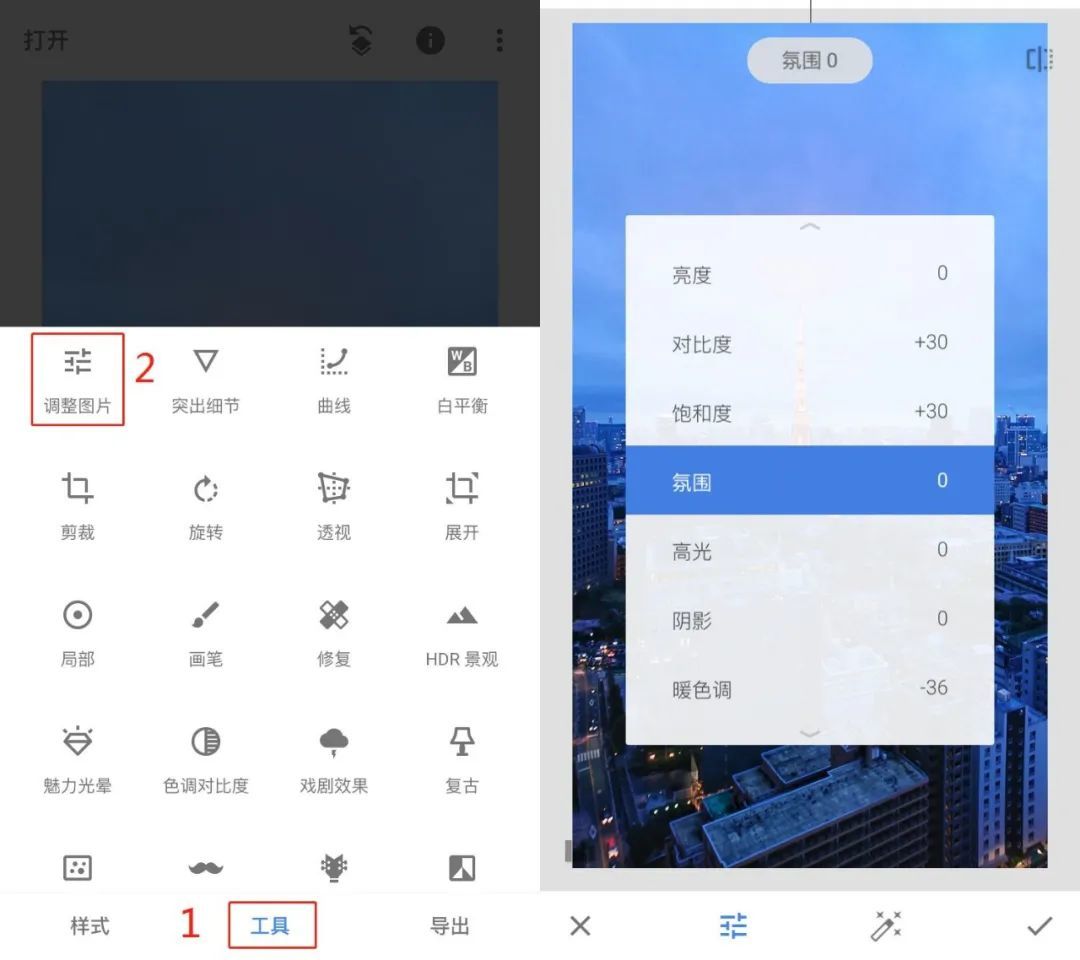 Tips:【氛围】是对画面不同区域对比度、实足度、亮度的详细退换,在采选擢升【氛围】时,相片细节会愈加丰富,色调更显明
