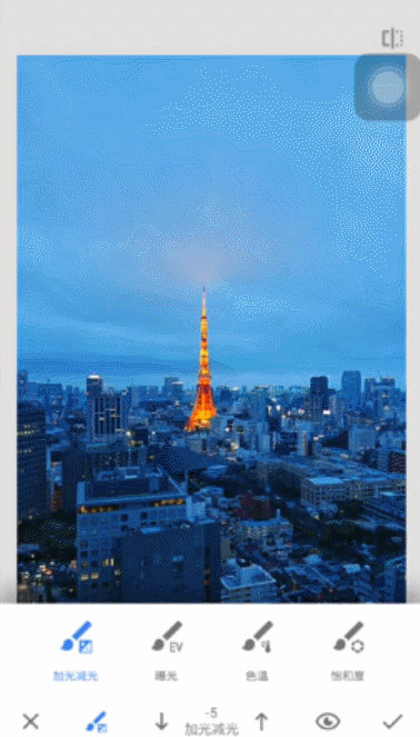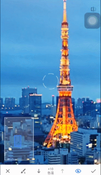 采选色温+10、实足度+10、加光减光参数+10,运转对画面中的晴空塔位置运转局部涂抹,增多暖橘色的恶果 ▼