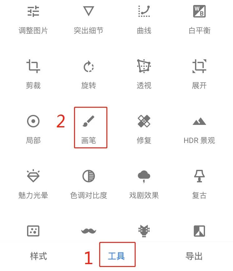 ●第一步:在界面底部【器具】采选【退换图片】,将相片合座亮度擢升+24,镌汰明暗对比