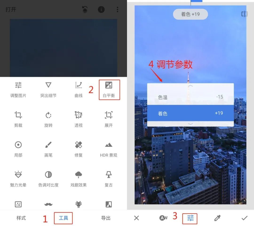 打造蓝调夜景,需要色调愈加偏蓝。采选【色调】向左滑动,将【着色】稳当调高,让画面中疏淡的灯光更隆起 ▼